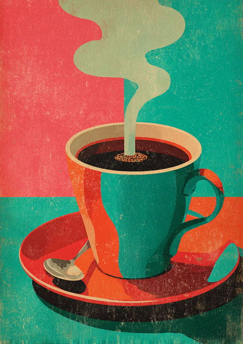 Start every morning right with this bold retro coffee illustration. A steaming teal coffee cup sits on a coral red saucer with a silver spoon, wisps of steam curling upward against a striking split background of pink and teal. The vintage risograph grain texture, saturated colour blocking, and mid-century graphic style give this piece a timeless café poster feel. A vibrant eye-catcher for your kitchen, dining area, coffee corner, or office. Printed on premium museum-quality paper with archival inks for lasting vibrancy.