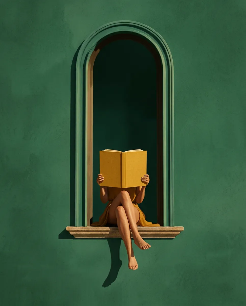 Maak een gedurfd statement met deze opvallende faceless kunstprint. Een blootsvoetse vrouw zit in een elegante stenen boognis, haar gezicht verborgen achter een opengeslagen mosterdgeel boek, gehuld in een gouden jurk tegen een rijke smaragdgroene muur. Het dramatische kleurcontrast, de architectonische omlijsting en de surrealistische compositie creëren een boeiend werk dat de aandacht trekt. Perfect als middelpunt voor je woonkamer, leeshoek of slaapkamer galerij wand. Gedrukt op premium museumkwaliteit papier met archivale inkten voor langdurige kleurvastheid.